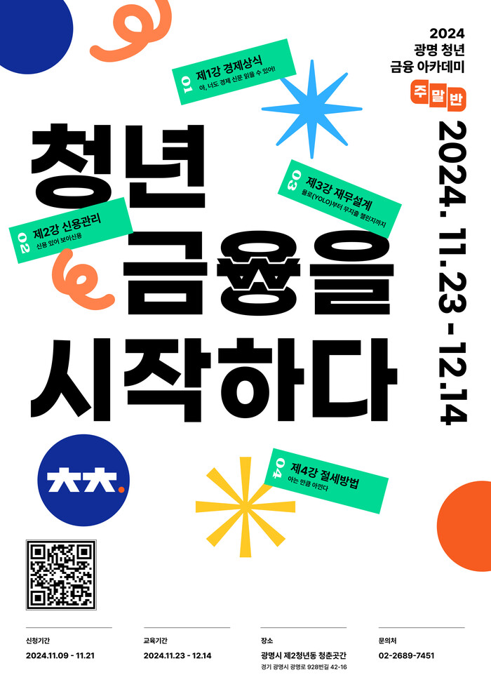 광명시(시장 박승원) 청년 경제 자립 특화 공간인 청춘곳간(센터장 이승희)이 오는 21일까지 지역 청년들의 경제적 자립을 위한 ‘2024 광명 청년 금융 아카데미 2기’ 수강생을 모집한다.