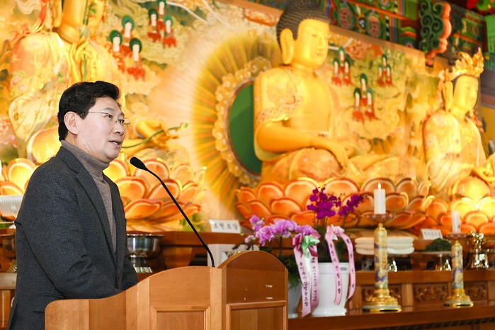 이상일 용인특례시장은 16일 오후 처인구 역북동 용인 호국선봉사 대웅전에서 열린 ‘2023년 용인시 불교연합회 송년 법회’에 참석했다.