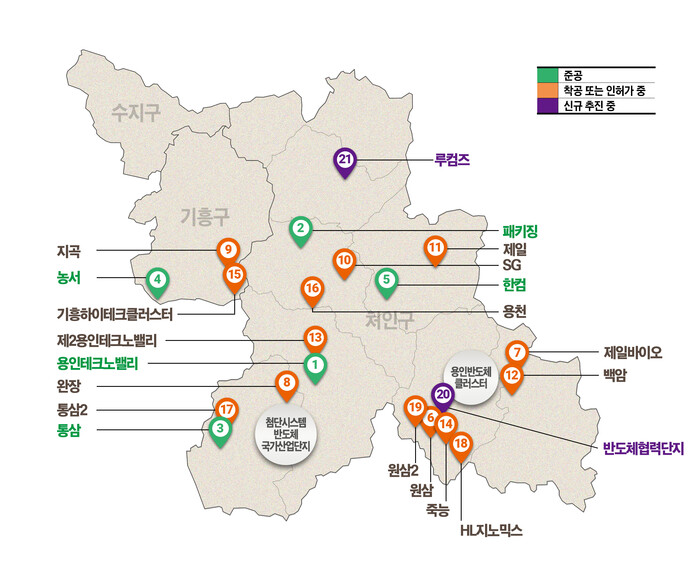 용인시엔 8월 현재 21개 일반산업단지가 조성되고 있는데, 이 가운데 용인테크노밸리, 패키징, 통삼, 농서, 한컴 등 5곳이 준공됐고, 원삼, 지곡, 제2용인테크노밸리 등 8곳이 착공돼 공사가 진행 중이며, 죽능, 통삼2 등 6곳은 사업계획 승인 절차를 밟고 있다. 또 용인반도체협력 산단 등 2곳이 산단물량을 공급받았거나 지정계획 신청 단계에 있다.