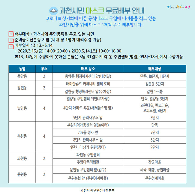 시는 13일까지 5만여장, 14일에 나머지 수량을 확보하여 6개동 주민센터에서 마련한 배부장소 16곳을 통해 전 세대에 배부한다. 13일은 14시부터 20시까지 배부가 진행되고, 14일에는 10시부터 18시까지 배부된다. 각 동의 배부장소는 과천시청 홈페이지(www.gccity.go.kr)와 공식 블로그 등 SNS 등을 통해서도 확인할 수 있다.