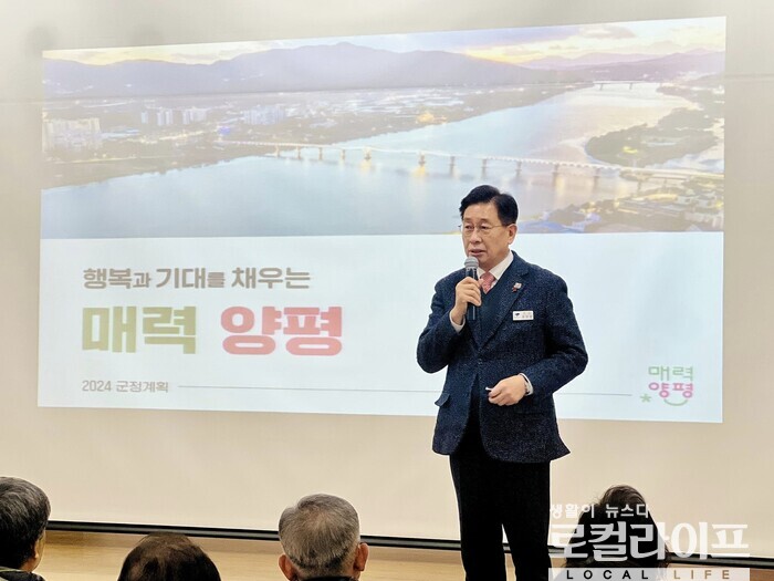 ▲ 전진선 양평군수가 단월면을 방문해 ‘2024년 군정계획’을 설명하고 있다. (사진출처=전진선 페이스북)