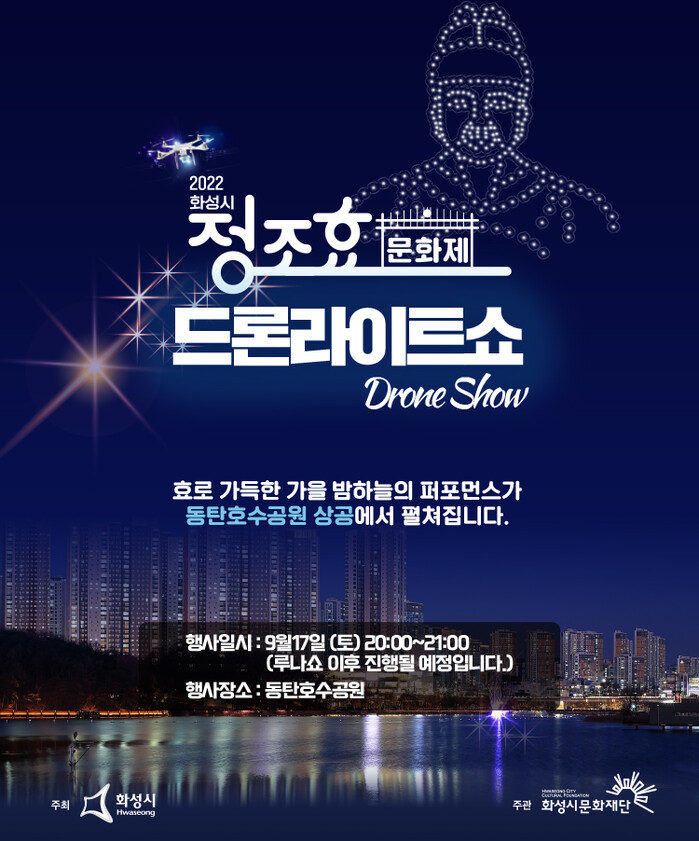 화성시가 오는 10월 8일부터 9일까지 이틀간 열리는 ‘2022 정조효문화제’에 앞서 사전 홍보로 드론 라이트쇼를 준비했다.