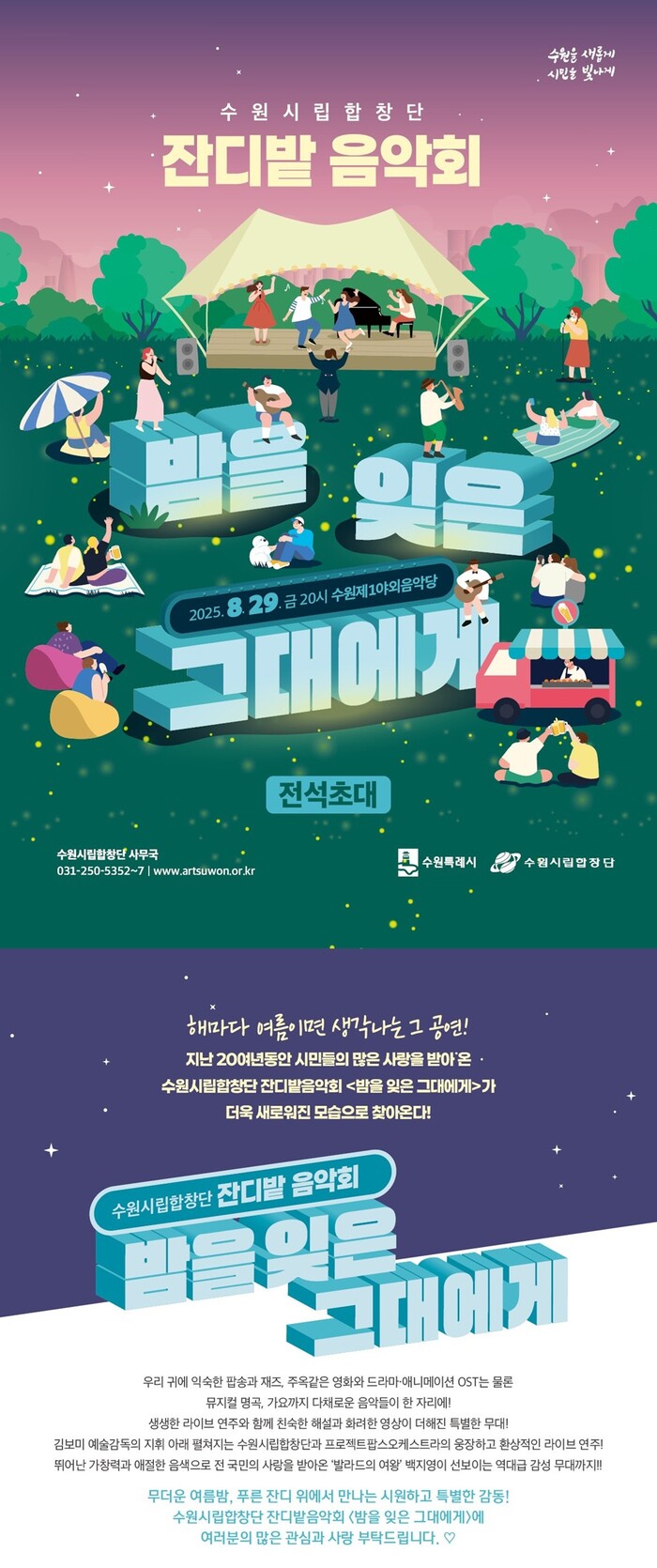 이어 "여름의 끝자락, 선선한 바람과 함께 잔디밭 위에서 울려 퍼지는 아름다운 선율. 수원만의 낭만이 가득한 '잔디밭 음악회'가 8월 29일(금) 저녁 수원 제1야외음악당에서 열린다"며 "올해는 수원시립합창단과 프로젝트 팝스 앙상블이 영화‧드라마‧애니메이션 OST 등 다채로운 무대를 선보이고, 특별히 가수 백지영 님이 함께해 깊은 감동을 더할 예정이다. 돗자리 하나만 챙기시면, 여름밤의 낭만을 만끽하실 수 있다"고 말했다.