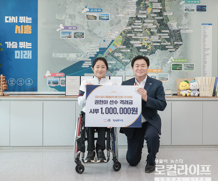 | ▲ 임병택 시흥시장(오른쪽)이 파리 패럴림픽 배드민턴 국가대표 권현아 선수(왼쪽)에게 격려금을 전달하고 있다. (사진출처=임병택 페이스북) |