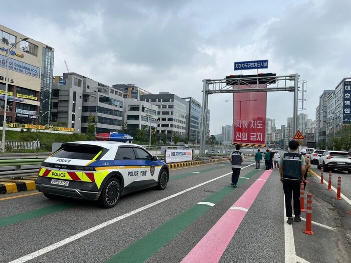 훈련에서는 지하차도 침수 상황을 가정해 도로 통제와 차량 우회 조치 후 진입 차단시설 작동 여부 등을 점검했다.