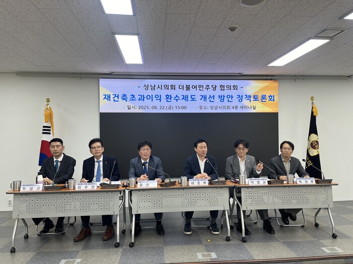 성남시의회 더불어민주당협의회는 22일, 성남시의회 4층 세미나실에서 「재건축초과이익 환수제도 개선 방안 정책토론회」를 개최하였다. 이번 토론회는 재건축초과이익 환수제도의 현황과 문제점을 진단하고, 공정하고 지속가능한 도시 재건축을 위한 제도 개선 방향을 모색하기 위해 마련되었다.