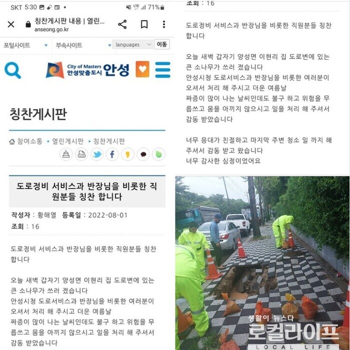 이어 “아무래도 야외에서 일을 하다보면 힘들고, 위험한 경우도 있을텐데 시민의 안전과 편리를 위해 애써주셔서 감사하다”며 “그리고 공무원 칭찬해주신 시민분께도 감사드린다”고 덧붙였다.
