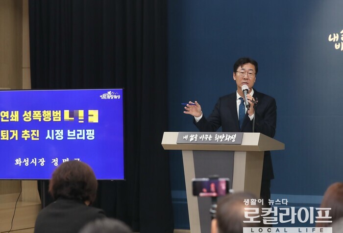 [화성=로컬라이프] 송준형 기자 = 정명근 화성시장은 시정브리핑을 갖고 연쇄 성폭행범의 퇴거에 대해 설명했다.