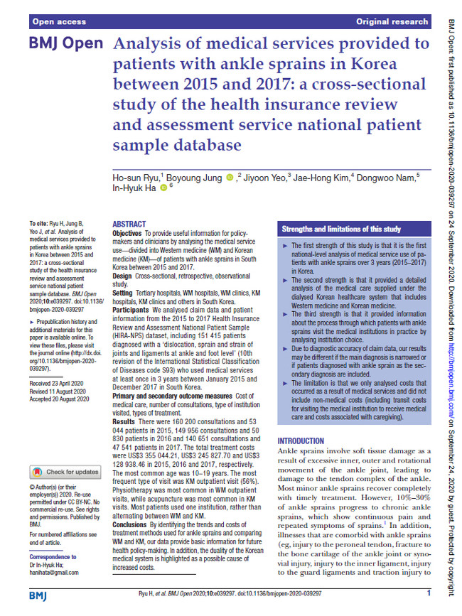 자생한방병원 척추관절연구소 류호선 한의사 연구팀은 국내 발목염좌 환자의 의료이용 현황을 연구 분석한 결과 한방의료기관에 대한 선호도가 가장 높다는 사실과 함께 의료진단기기의 제한으로 환자의 시간적·경제적 비용이 발생하는 것으로 나타났다고 19일 밝혔다. 해당 논문은 SCI(E)급 국제학술지 ‘BMJ Open (IF=2.496)’ 9월호에 게재됐다.