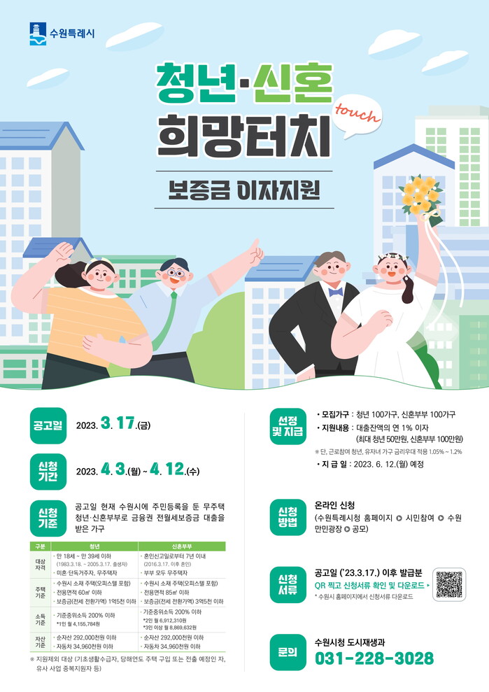 수원시가 무주택 청년·신혼부부 가구에 임차보증금 대출 이자를 지원하는‘청년·신혼 희망터치 보증금 이자지원’ 사업 참여자를 4월 3일부터 12일까지 모집한다.