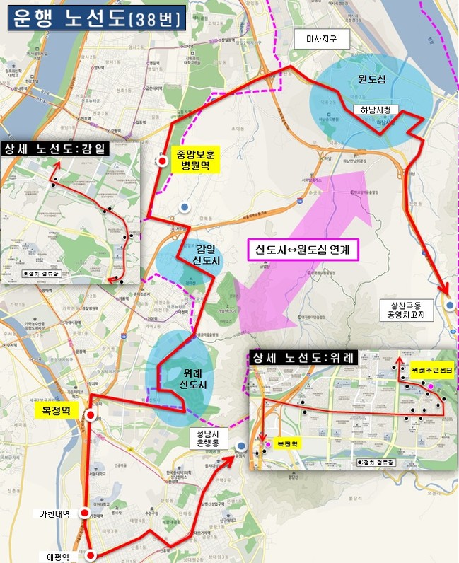 이에 시는 기존 원도심~잠실역~중앙보훈병원~위례·감일 신도시~성남 은행동을 운행되던 시내버스 30-1번을 잠실역을 경유하지 않는 경로로 변경하여 38번 버스를 새롭게 운행할 계획이다.