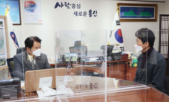 사진/백군기 용인시장과 정종태 한국주택금융공사 경기동부지사장이 12월 15일 시장실에서 개소식을 대신해 환담을 나누고 있다.(사진제공=용인시)