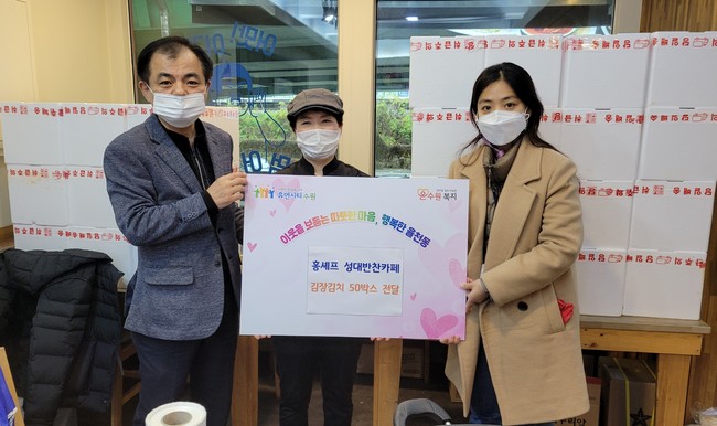 지난 19일 수원시 율천동 행정복지센터에 각별한 의미가 더해진 김장김치가 전달됐다. 어려운 이웃 주민들에게 나눠줄 김치 50박스(10㎏)를 직접 만들어 보낸 사람은 율전동에서 ‘홍셰프 성대반찬가게’를 운영하고 있는 홍영남씨였다.