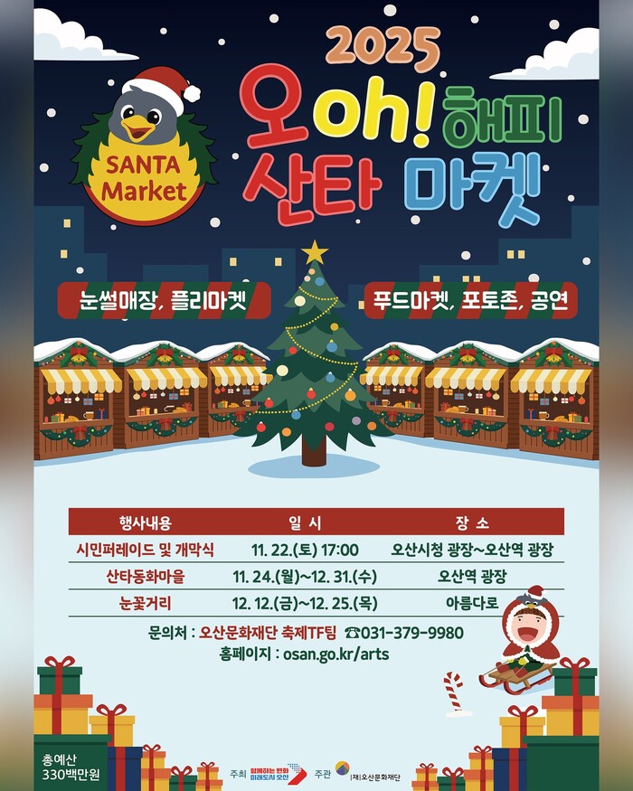 이어 “오산역광장에 자리한 산타동화마을에서는 대형 크리스마스 트리, 눈썰매장, 회전목마, 경관조명 포토존 등이 가족과 아이들의 웃음소리를 기다린다”며 “아름다로 일대(오산역 광장 맞은편)는 눈꽃거리로 변신해 LED로 수놓인 겨울밤의 낭만 속에서 플리마켓과 버스킹 공연이 이어지며 산타마켓의 낭만을 더해줄 것이다”라고 말했다.