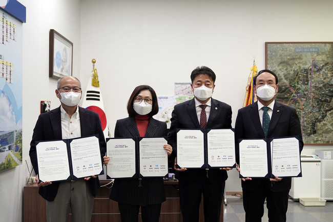 <사진/ 왼쪽부터 김병삼 ㈔월드휴먼브리지 대표-은수미 성남시장-박문석 성남시의회 의장-박용후 성남상공회의소 회장 순 >