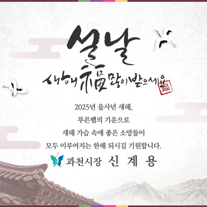 아울러 신 시장은 2025년 을사년 새해, 푸른 뱀의 기운으로 새해 가슴속에 좋은 소망들이 모두 이루어지는 한 해 되시길 기원한다고 덧붙였다.