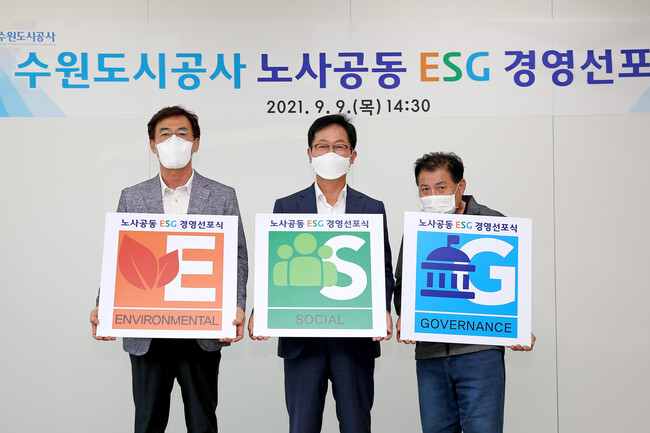 수원도시공사는 9일 이상후 사장과 수원도시공사 노동조합 대표 등이 참석한 가운데 더함파크 3층 중회의실에서 ‘노사공동 ESG 선포식’을 열고 ESG 경영 완성을 위해 총력을 다 할 것을 공식 선언했다.