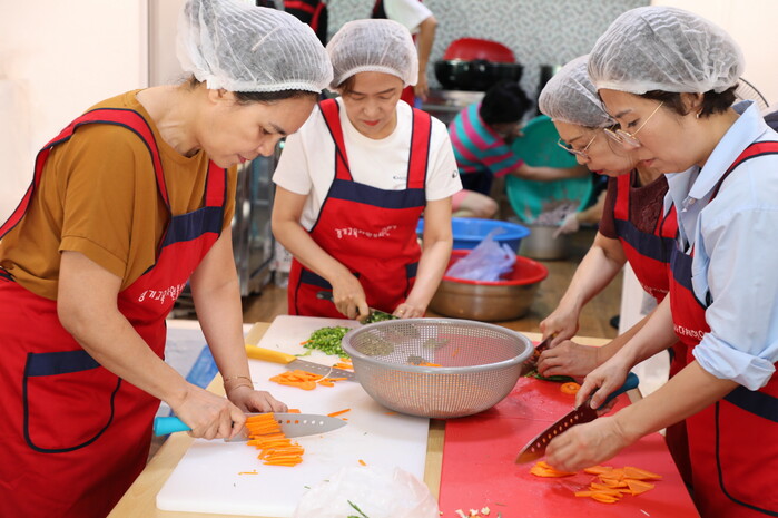 사진/박광온 더불어민주당 원내대표의 부인 김희정(왼쪽)씨와 이재준 수원특례시장 부인 이지영(오른쪽)씨, 사정희(뒤쪽 가운데) 수원시의회 의원이 1일 수원시 매탄 4동 경기교육자원봉사단체협의회 조리시설에서 수원역 무료 급식 반찬을 만들기 위해 야채를 썰고 있다.(사진제공=수원시)