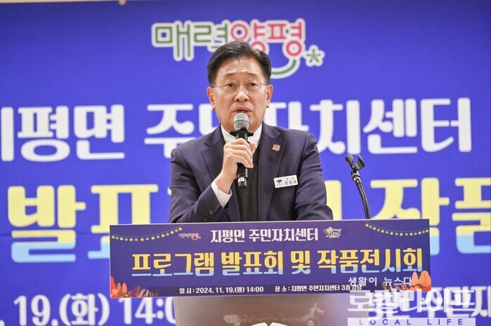 | ▲ 전진선 양평군수가 ‘지평면 주민자치센터 프로그램 발표회 및 작품전시회’에 참석해 인사말을 하고 있다. (사진출처=전진선 페이스북) |
