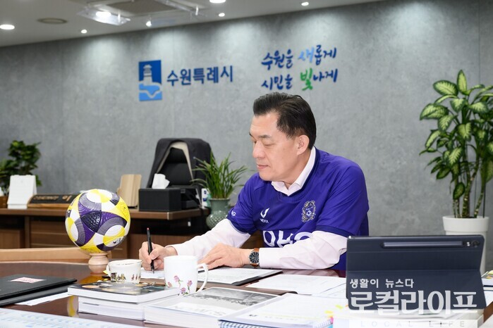 [수원=로컬라이프] 송준형 기자 = 이재준 수원특례시장이 지난 19일 열린 수원FC와 FC안양 경기에 앞서 자신이 내건 공약을 이행했다.