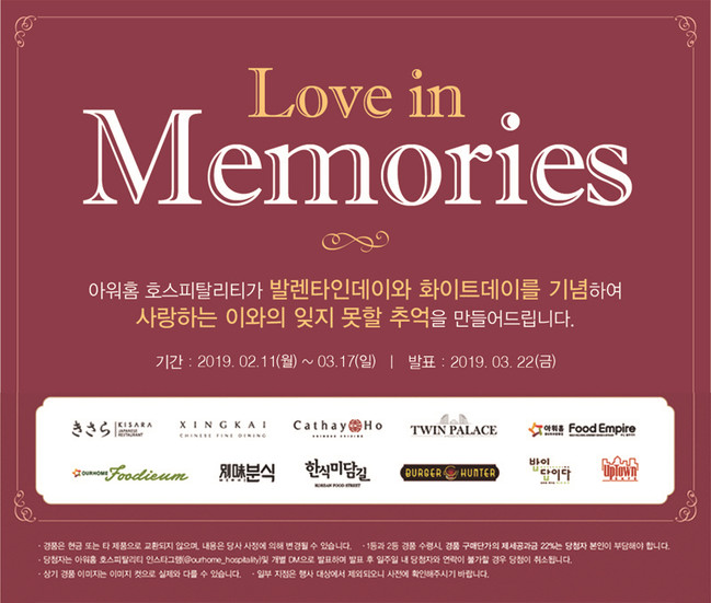 먼저 3월 17일까지 아워홈 외식매장 20곳에서 연인들을 위해 ‘러브 인 메모리즈(Love In Memories)’ 프로모션을 진행한다. 참여 방법은 매장에서 식사 후 인스타그램에 지정 해시태그와 함께 메뉴 및 매장 인증사진을 게재하면 된다.