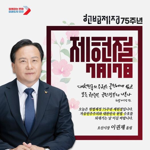 이와 관련해 이권재 오산시장은 이날 자신의 페이스북을 통해 오늘은 나라를 사랑하는 마음으로 자유민주주의와 대한민국 헌법 수호를 되새기는 날이길 바란다고 전했다.