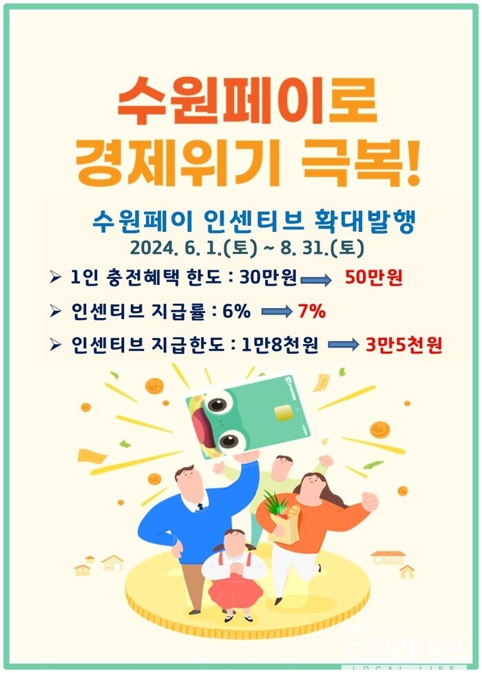 [수원=로컬라이프] 송준형 기자 = 수원특례시가 지역화폐인 ‘수원페이’의 인센티브를 8월 말까지 석달간 확대한다.