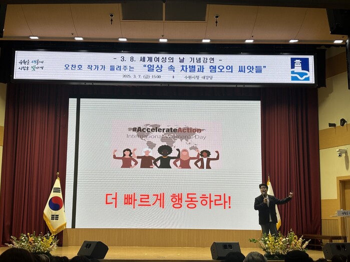 수원시(시장 이재준)가 ‘세계여성의 날(3월 8일)’을 기념해 7일 수원시청 대강당에서 오찬호 작가의 특강을 열었다.
