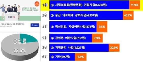 그러면서 응답자 중 '시립의료원(종합병원) 건립사업' 이71.9%(6,630명)로 가장 높았고, 다음으로 '응급 의료체계 강화사업'이 46.7%(4,307명)로 조사되었다고 전했다.