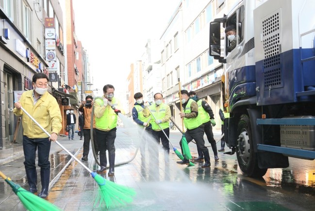안양시, 코로나19 예방 '다중집합장소 7곳' 릴레이 물청소...상점가 활기 희망