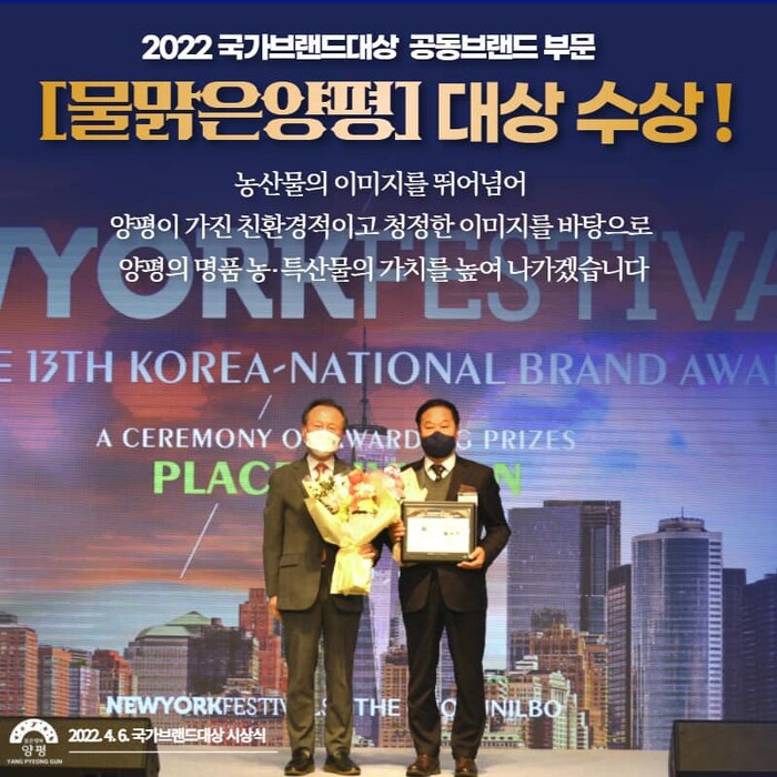 이와 관련해 정동균 군수는 6일, 자신의 페이스북을 통해 대한민국을 대표하는 최고의 브랜드를 부문별로 시상하는 "2022 국가브랜드 대상"에서 양평군을 대표하는 농특산물 공동브랜드인 <물 맑은 양평>이 공동브랜드 부분에서 영예의 대상을 수상했다고 밝혔다.