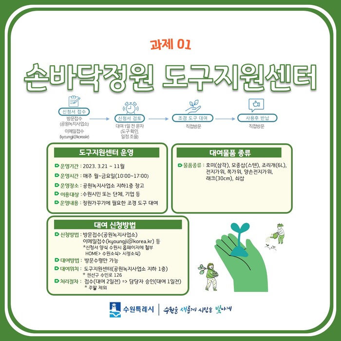 수원시 홈페이지(https://www.suwon.go.kr) ‘시정소식’ 게시판 검색창에 ‘도구지원센터’를 검색해 신청서를 내려받아 작성한 후 대여 희망일 2일 전까지 전자우편(kyoungji@korea.kr) 또는 방문(수원시 권선구 수인로 126 수원시공원녹지사업소) 제출하면 된다. 조경 도구는 방문 수령해야 한다.