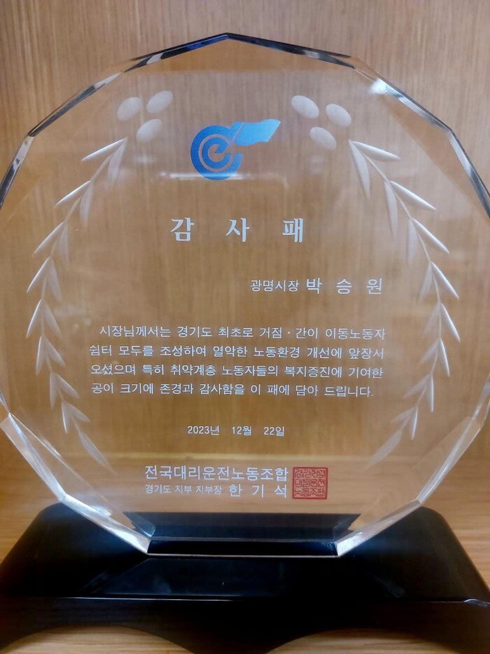 [로컬라이프] 박현우 기자 = 박승원 광명시장은 전국대리운전 노동조합 경기지부로부터 감사패를 받았다