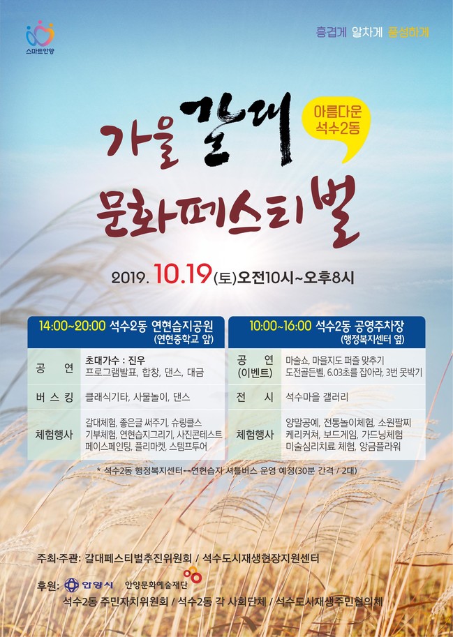 안양시는 석수2동이 주관하는‘가을 갈대문화페스티벌’이 주말인 19일 안양천 연현습지공원과 석수2동 청사 앞 공영주차장에서 벌어진다고 밝혔다.