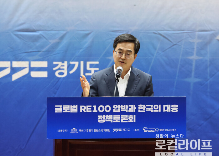 | ▲ 김동연 경기도지사가 「글로벌 RE100 압박과 한국의 대응」 국회토론회에서 인사말을 통해 정부가 첫 번째로 조달해야 할 공공재로 '기후위기 대응'을 꼽았다. (사진제공=경기도) |