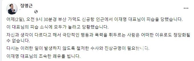 이어 “다시는 이러한 일이 발생하지 않도록 철저한 수사와 진상규명이 필요하다”며 “이재명 대표님의 조속한 쾌유를 빈다”고 말했다.