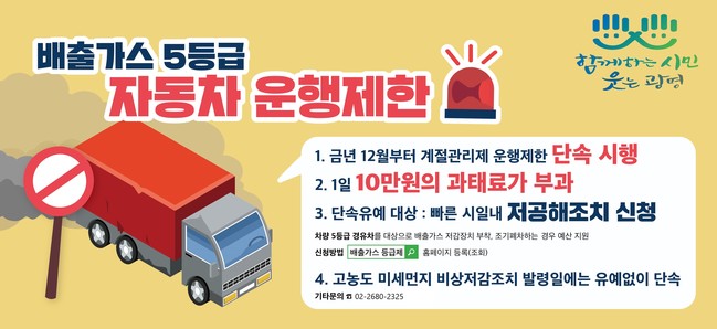 또한, 올해 본격 시행하는 계절관리제는 미세먼지 관련 자동차 운행제한의 하나로 고농도 미세먼지가 우려되는 기간인 매년 12~3월 동안 5등급 노후경유차의 운행을 제한하는 것이다. 이 기간에 서울과 인천에서 운행하면 해당 시 조례에 따라 10만원 이하의 과태료가 부과될 예정이다. 다만, 경기도는 5월 19일 조례에 따라 ‘저공해조치 신청서’를 제출한 차량과 저공해장치 부착이 불가한 차량의 과태료 부과를 내년 3월 31일까지 유예한다.