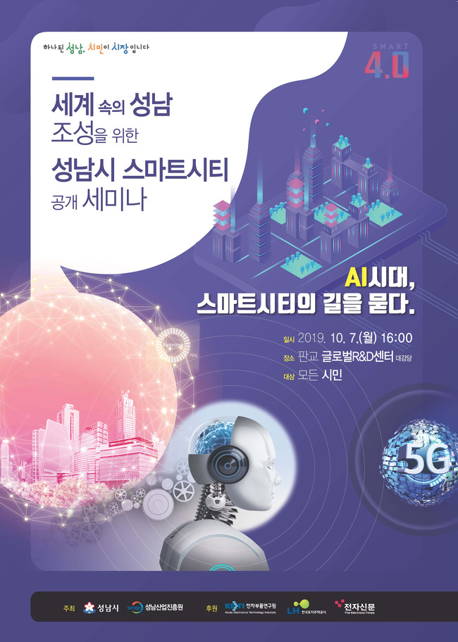 이날 세미나는 시민들이 편리하고 쾌적한 삶을 누릴 수 있도록 인공지능과 최첨단 정보통신기술(ICT)로 도시 생활 속 교통·환경·주거 문제 등을 해결하는 전략을 모색하기 위해 마련되고, 성남시민 누구나 무료로 참여할 수 있다.