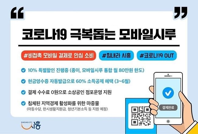 사람과 사람 간의 접촉에 의해 전파되는 코로나19가 확산하면서 비접촉식 결제가 가능한 시흥시 지역화폐 모바일 시루도 급격하게 확산하고 있다. 국내 지자체 중 최초로 모바일 결제시스템을 도입한 시흥시 지역화폐 모바일 시루는 소비자가 스마트폰에서 가맹점 QR을 스캔하면 결제가 이뤄지는 방식이다.