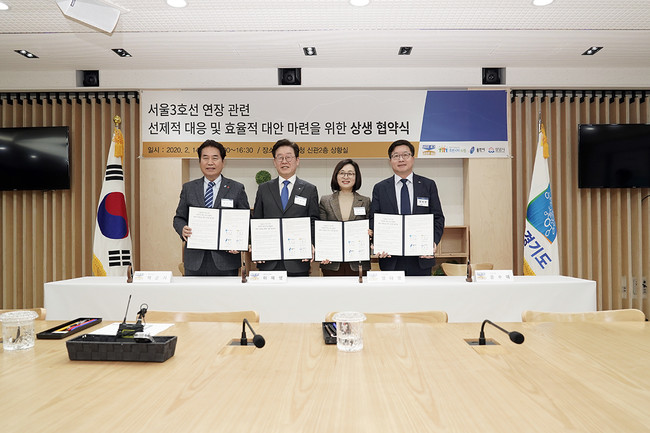성남시와 수원시, 용인시, 경기도 등 4곳 광역‧지방 자치단체는 2월 14일 오후 4시 경기도청 신관 2층 상황실에서 ‘서울 3호선 연장 관련 선제 대응과 효율적 대안 마련을 위한 상생 협약’을 했다.