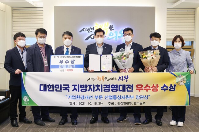 그동안 기업SOS 지원단 운영, 중소기업육성자금 이자지원 의왕테크노파크 조성 자족 시설 용지 (고천・초평 지구 등)를 활용한 대규모 투자 유치 포일어울림센터 창업 지원 공간 설치 운영 청년 창업주택 건립 등 기업 환경 개선과 기업 유치를 위한 다양한 노력을 인정받아 산업통상자원부 장관상을 수상하게 되었다고 강조했다.