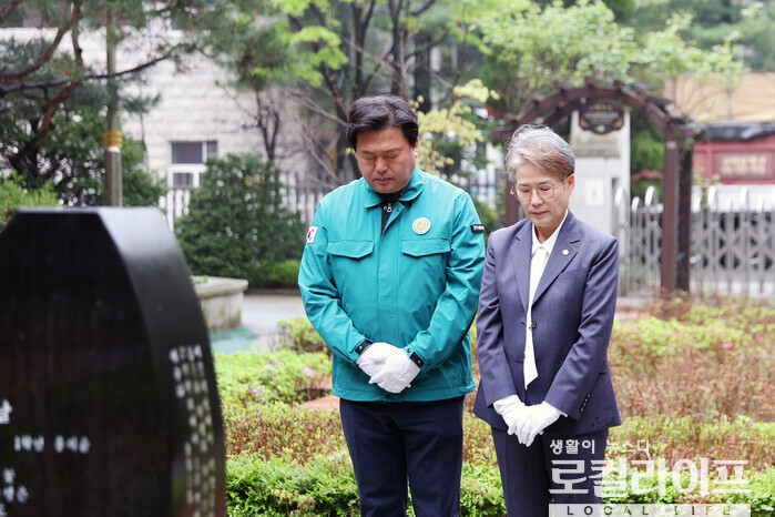 | ▲ 임병택 시흥시장(왼쪽)과 송미희 시흥시의회 의장(오른쪽)이 세월호 참사 10주기를 맞아 세월호 승무원으로 학생들의 대피를 위해 노력하다 희생된 의사자 박지영 씨 추모비를 참배하고 있다. (사진출처=임병택 페이스북) |