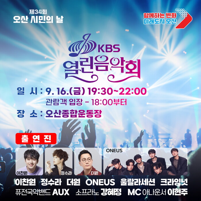 [오산=로컬라이프] 송준형 기자 = ‘제34회 오산시민의 날’을 기념하기 위한 KBS 열린음악회가 오는 9월 16일 금요일 오후 7시 30분 오산종합운동장에서 열린다.