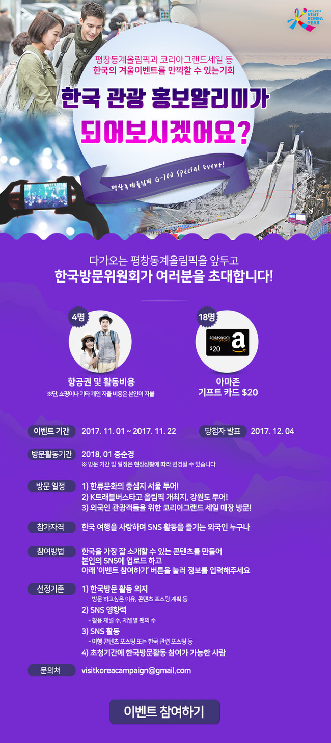 (재)한국방문위원회는 오는 11월 1일부터 약 3주간 전 세계 외국인을 대상으로 평창동계올림픽 G-100을 기념한 온라인이벤트를 진행한다.
