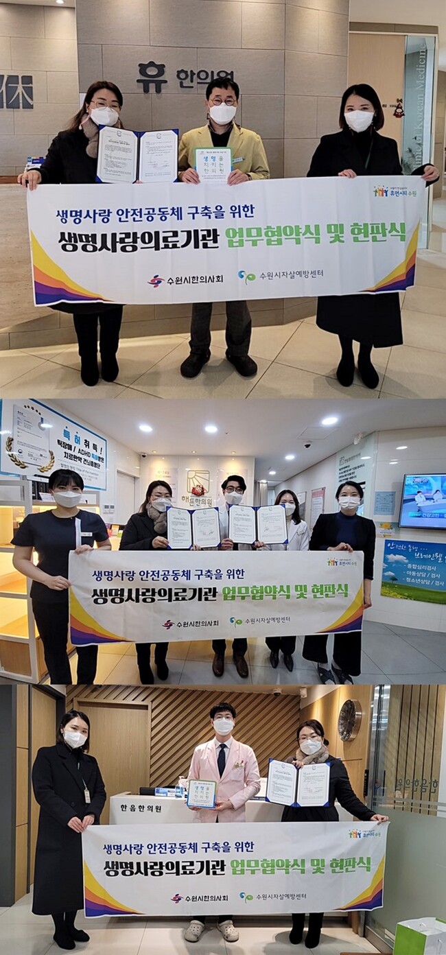 수원시정신건강사업단은 14일 한음한방신경정신과 한의원(팔달구), 해든 한의원(팔달구), 휴한의원(권선구) 등 3곳을 방문해 협약을 체결하고, ‘생명사랑 의료기관’ 현판을 전달했다.