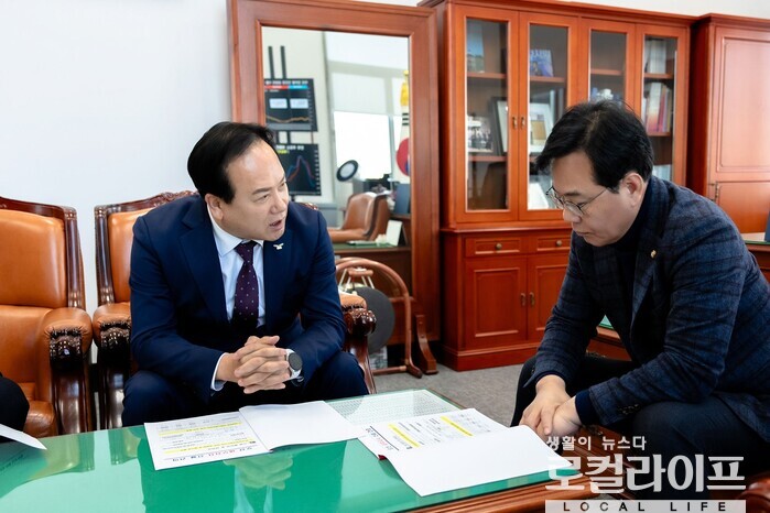 | ▲ 이권재 오산시장(왼쪽)이 송언석 국회의원(오른쪽)을 만나 지역 현안에 대해 설명하고 있다. (사진출처=이권재 페이스북) |