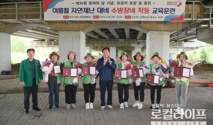 | ▲ 이권재 오산시장(가운데)이 ‘여름철 재난대비 수방장비 작동 훈련’에서 유공자들에게 표창하고 있다. (사진출처=이권재 페이스북) |