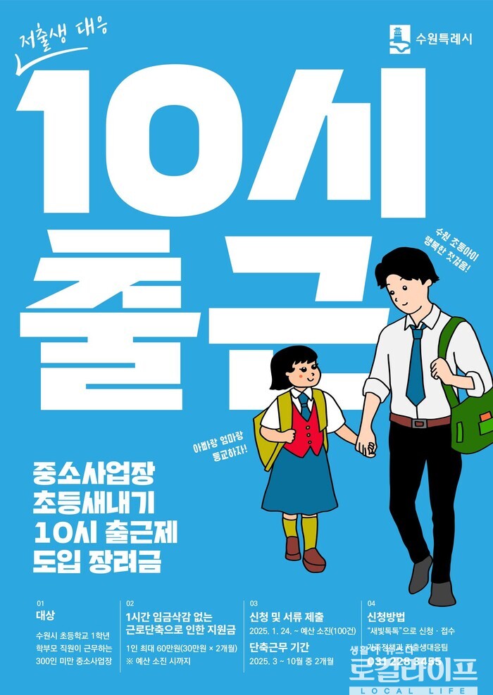 [수원=로컬라이프] 송준형 기자 = 수원특례시가 ‘중소사업장 초등새내기 10시 출근제 도입 장려금’ 제도를 시행한다.
