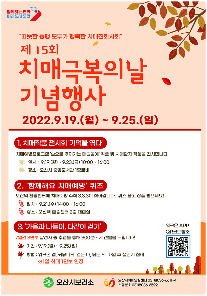 이번 행사는 △중앙도서관 1층 로비 전시관에서 치매예방 및 쉼터 프로그램 작품을 전시하는 ‘기억을 엮다’전시회 △오산역 환승센터 2층에서 치매예방 수칙 3.3.3을 배우고 직접 퀴즈를 풀며 치매 예방수칙 실천을 다짐하는‘함께 해요 치매예방’퀴즈 △워크온 앱 오산시치매안심센터 커뮤니티‘걷는 나 뛰는 뇌’를 활용한 걷기 챌린지‘가을과 나들이, 다같이’△기타 페이스북·밴드·SNS 등 각종 매체를 활용한 치매 예방 홍보 등 다양한 캠페인을 진행된다.