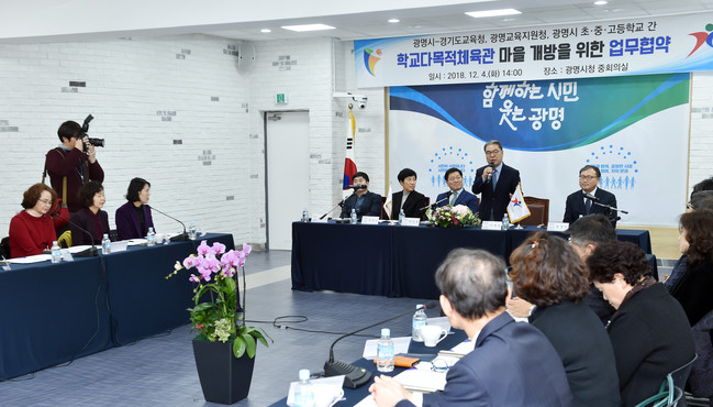 이재정 경기도교육감은 12월 4일 광명시청에서 열린‘광명시 학교 다목적체육관 마을 개방 업무 협약식’에 참석했다.